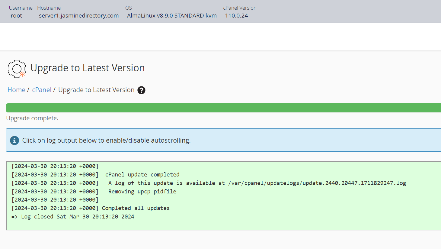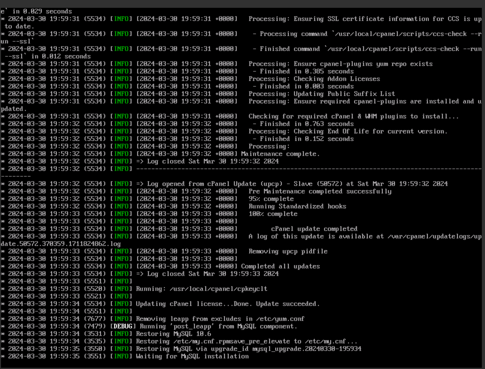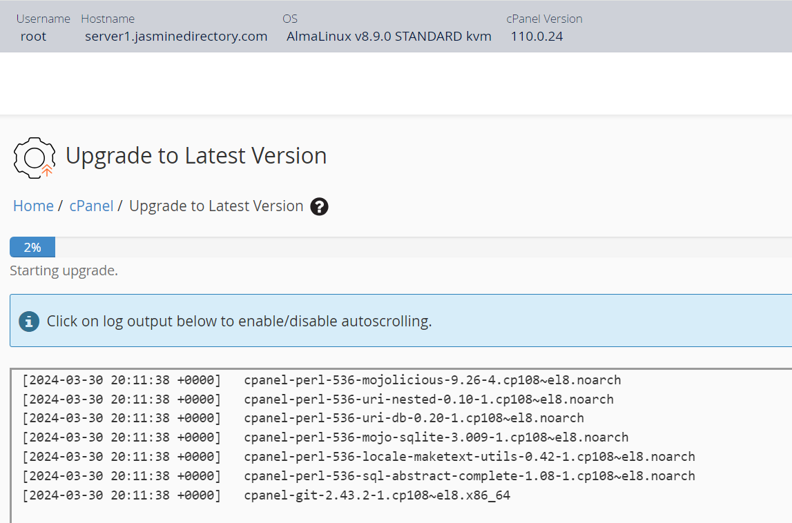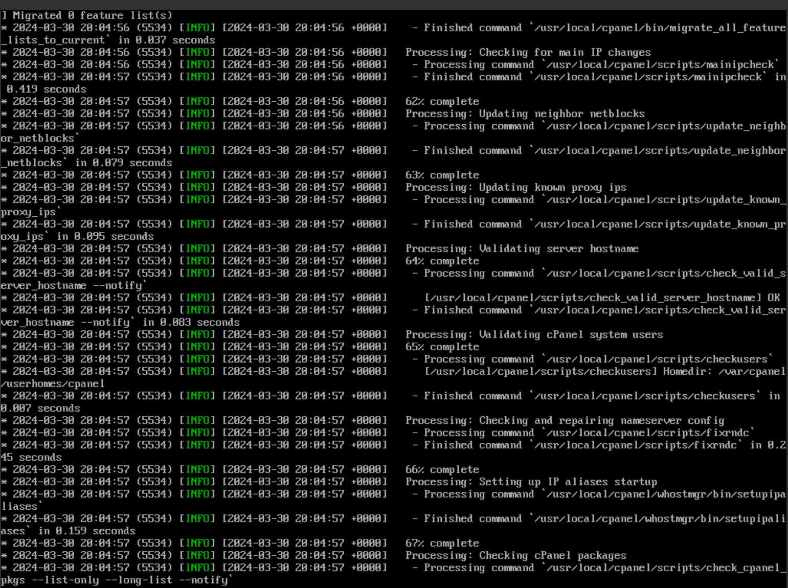 From now on, everything went (mostly) smooth. All you need is patience. If the cPanel elevation script fails for any reason, the upgrade will stop, everything will roll back to the pre-upgrade status.