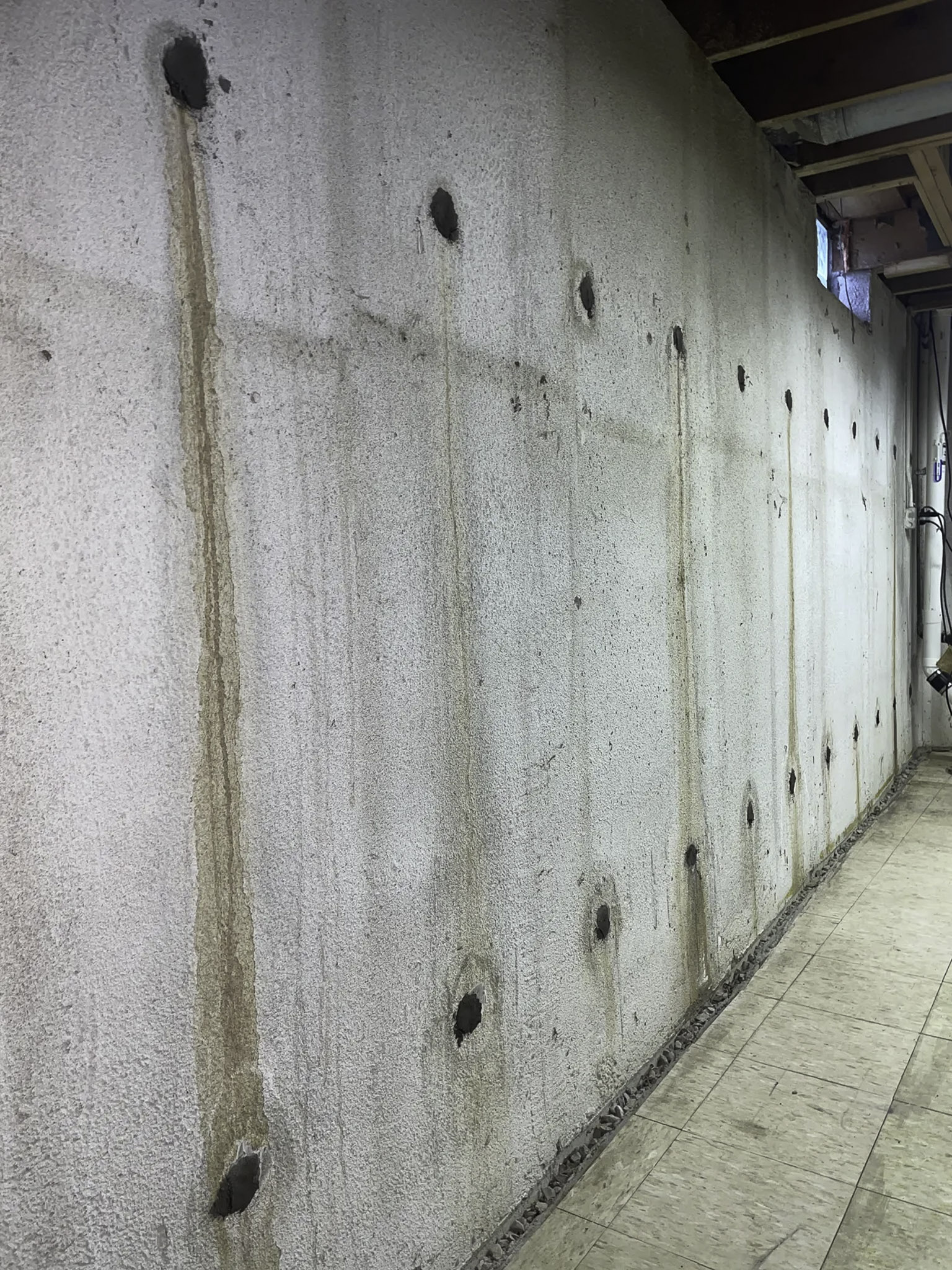 Tie rod holes represent another common water entry point in poured concrete foundations. Every poured foundation wall was formed using steel tie rods that held the form panels at the correct spacing during concrete placement. After curing, the forms were removed, and the rods were cut, leaving small through-wall penetrations at regular intervals across the foundation.