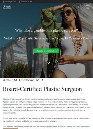 Dr. Arthur Cambeiro, certified by the American Board of Plastic Surgery, runs the centers. His reputation is highlighted by his receipt of multiple Top Doctor Awards and his positive patient reviews. Additionally, both the Las Vegas and Henderson locations provide potential patients with a map of their respective areas, making them easily accessible.