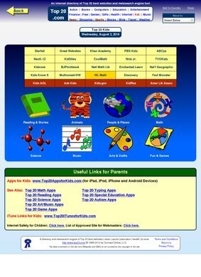 Top 20 Kids added: 14-Mar-2013, updated: 21-Jul-2020 | Edit Mostly educational, art and nature driven directory for kids of all ages. Also includes a safe search engine for kids in all domains of interest to them. URL